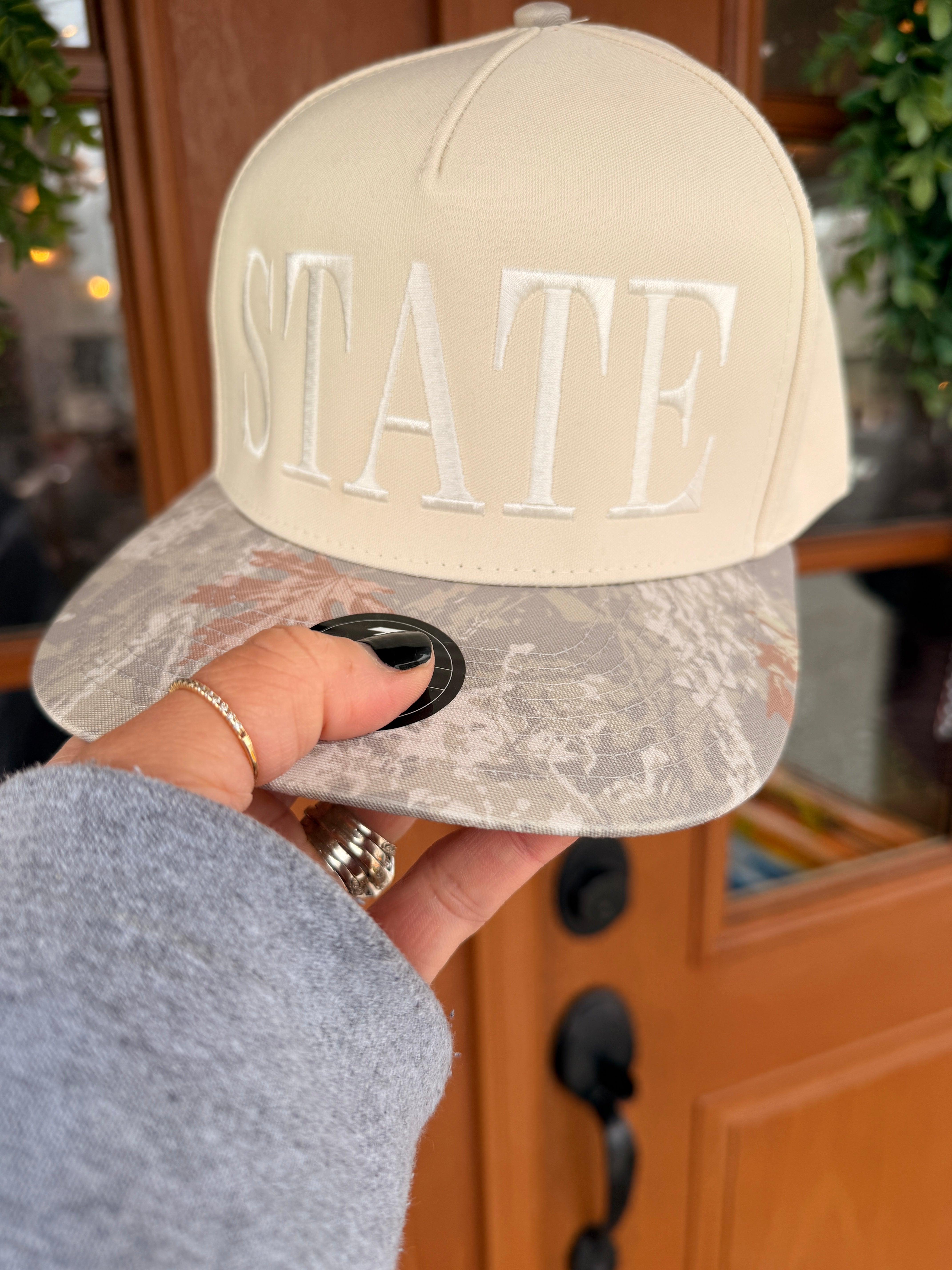 Rock your State pride in style with our State Camo Hat! Featuring an adjustable fit and a unique light color camo design with cream thread, this hat is perfect for any State fan. Go State in the most fashionable way possible.